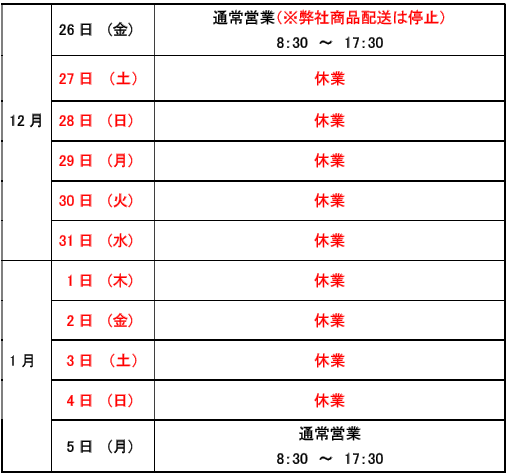 さて、弊社では誠に勝手ながら、本年度の年末年始休業を以下の日程で実施させていただきます。